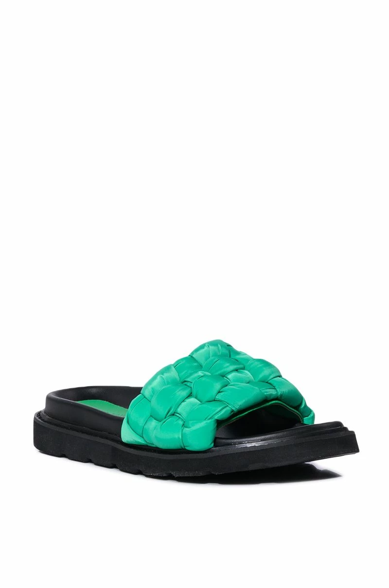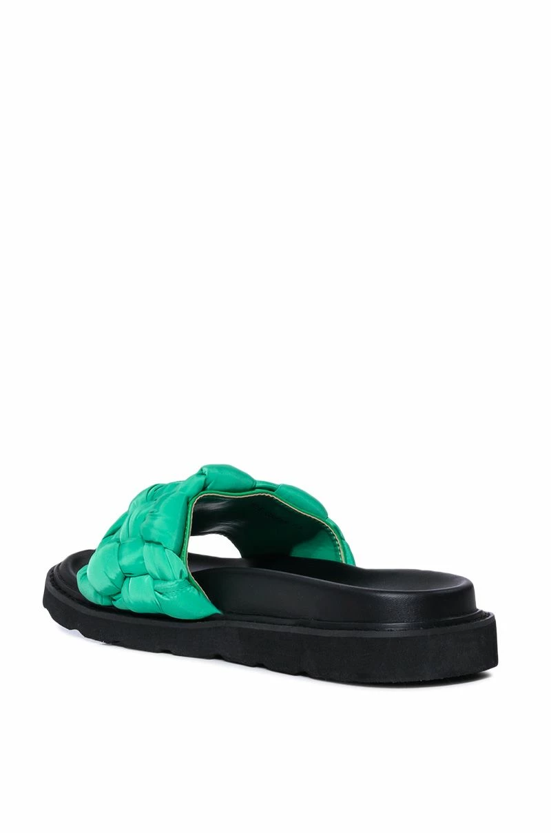 The AZALEA WANG Bee Flat Sandal In Green is a flatform slip-on sandal featuring a plush, braided puffer fabric band, an open toe design, and a chunky flatform base sole.