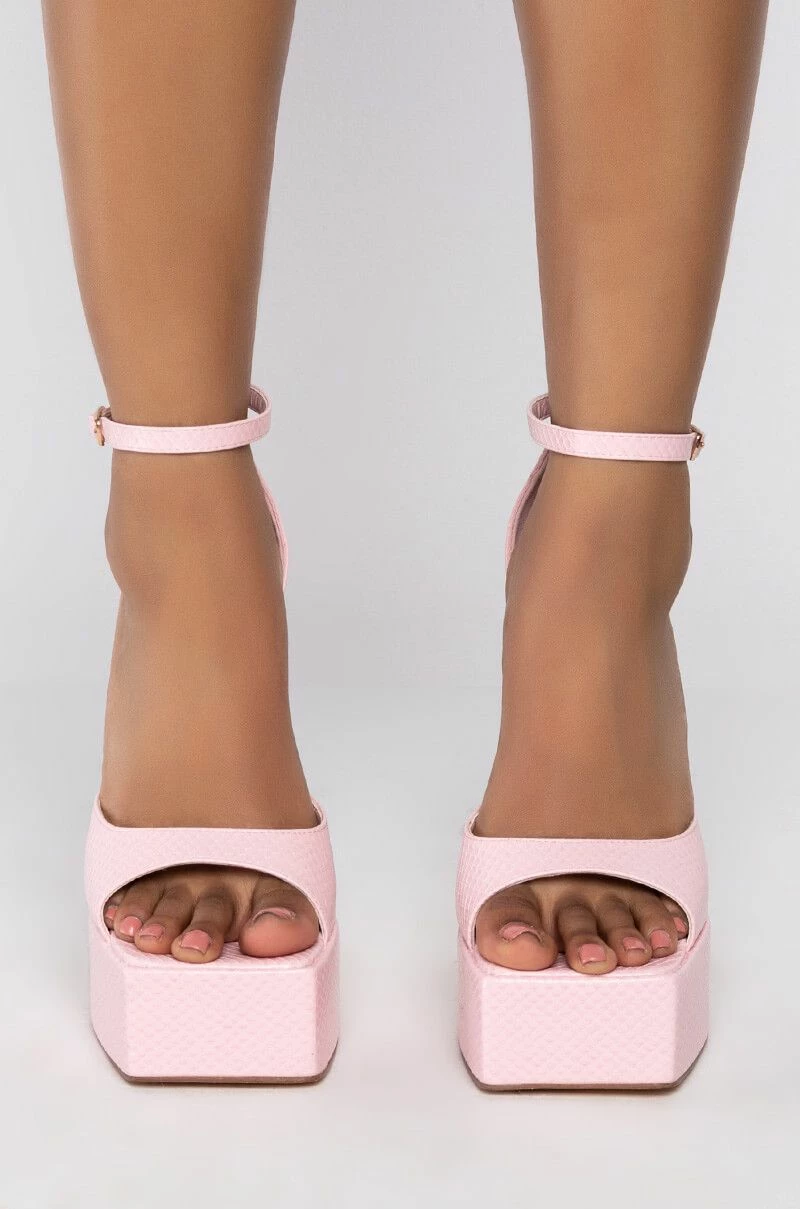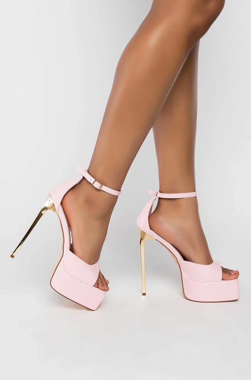 The AZALEA WANG Catch Flights Not Feelings Stiletto Sandal In Pink features a snake-embossed faux leather upper and footband, an open square toe design, a platform sole, and a towering metallic stiletto heel. Complete with a buckle fastening.