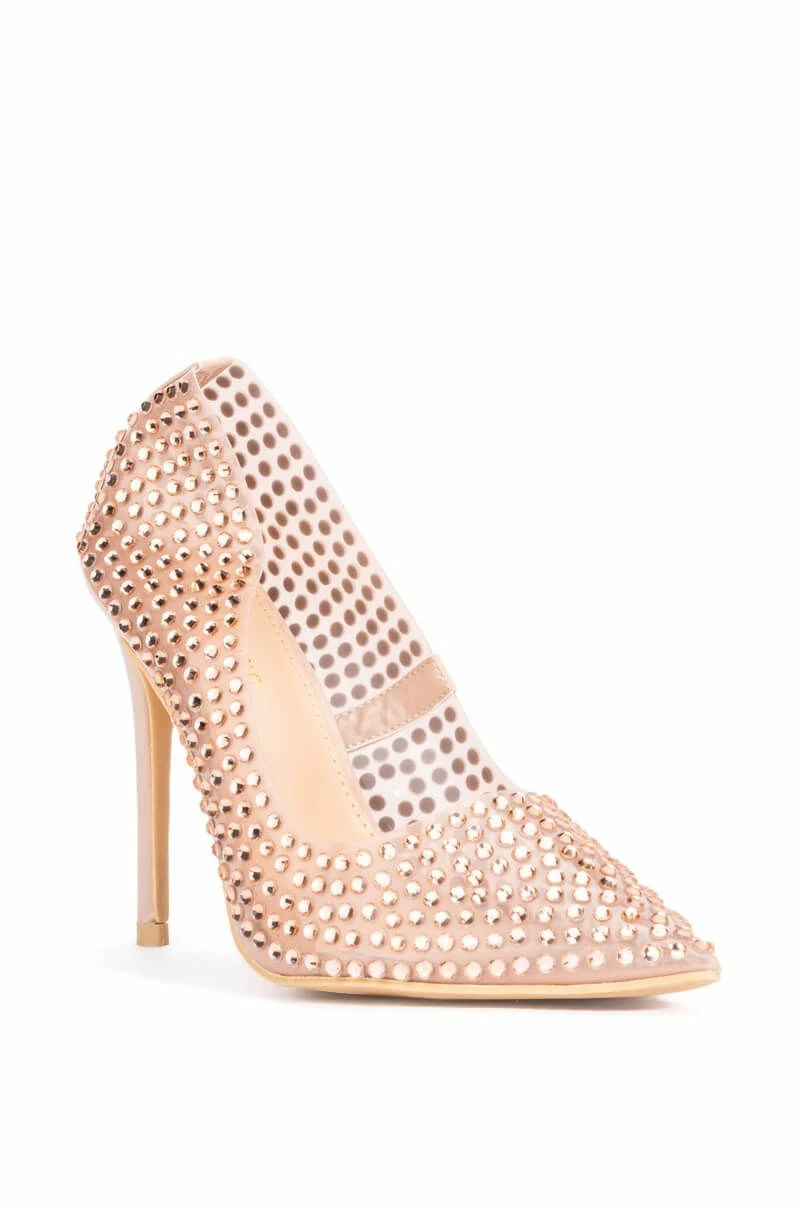 We found your dancing shoes! The Azalea Wang Find Me On The Dancefloor Rhinestone PCV Pump in Nude is an ultra-glam pump featuring a translucent PVC base, tonal rhinestone embellishments, a pointed toe, a faux leather stiletto heel, and a coordinating faux leather strip along the back heel. A shoe fit for a dancing queen!