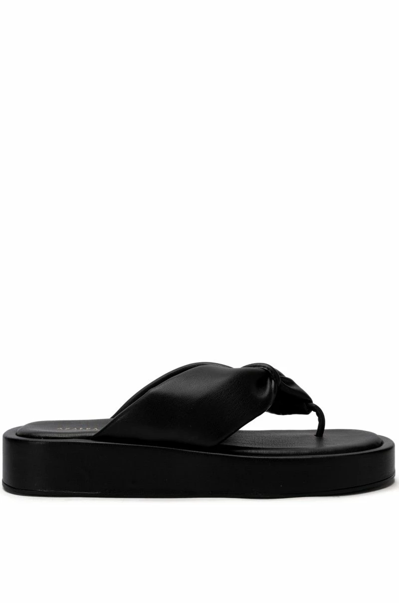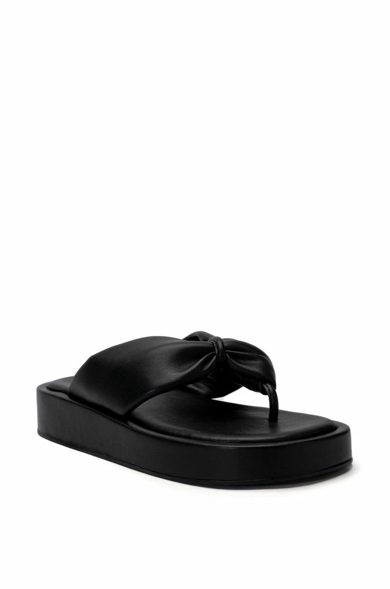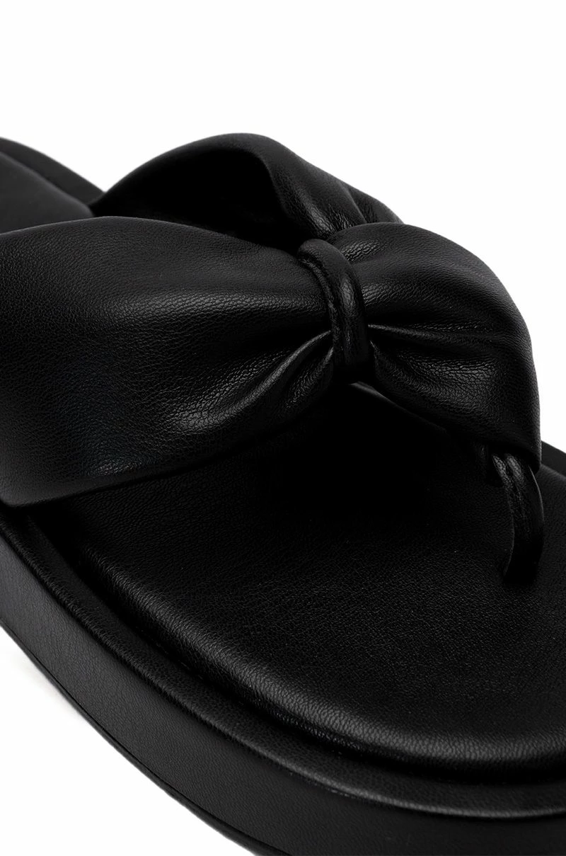 It’s like that! The AZALEA WANG I Want It I Got It Flat Sandal In Black is a chic casual sandal featuring a thong silhouette, a vegan leather upper, knot front straps, a step in fit, and a flatform sole.