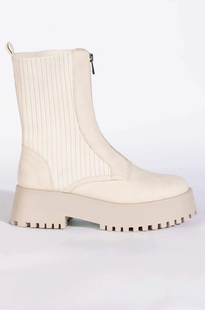 Peak chic. The AZALEA WANG Kennedy Knit Front Zip Flatform Bootie in Bone is the perfect transitional piece. This beauty features a faux suede and ribbed knit upper, a round toe design, a tonal rubber flatform base, and an exposed front zipper closure. Pair with flannels and cut off denim for now and tights and knits later.
