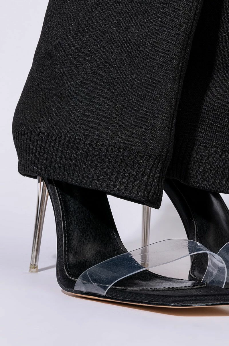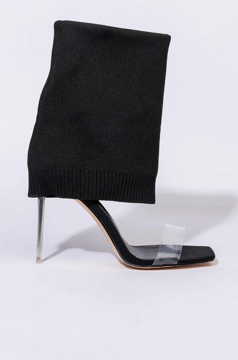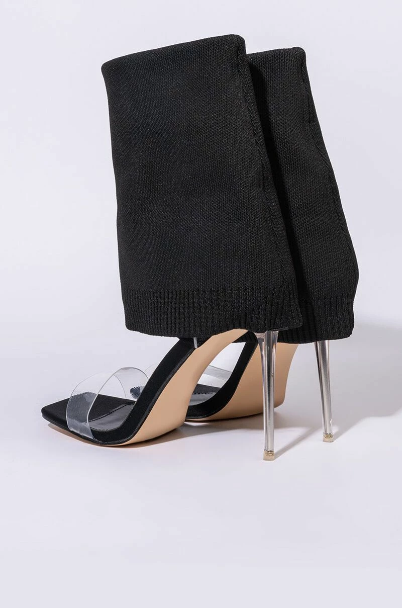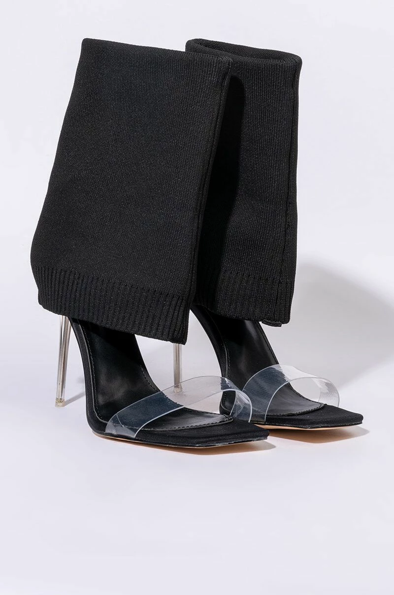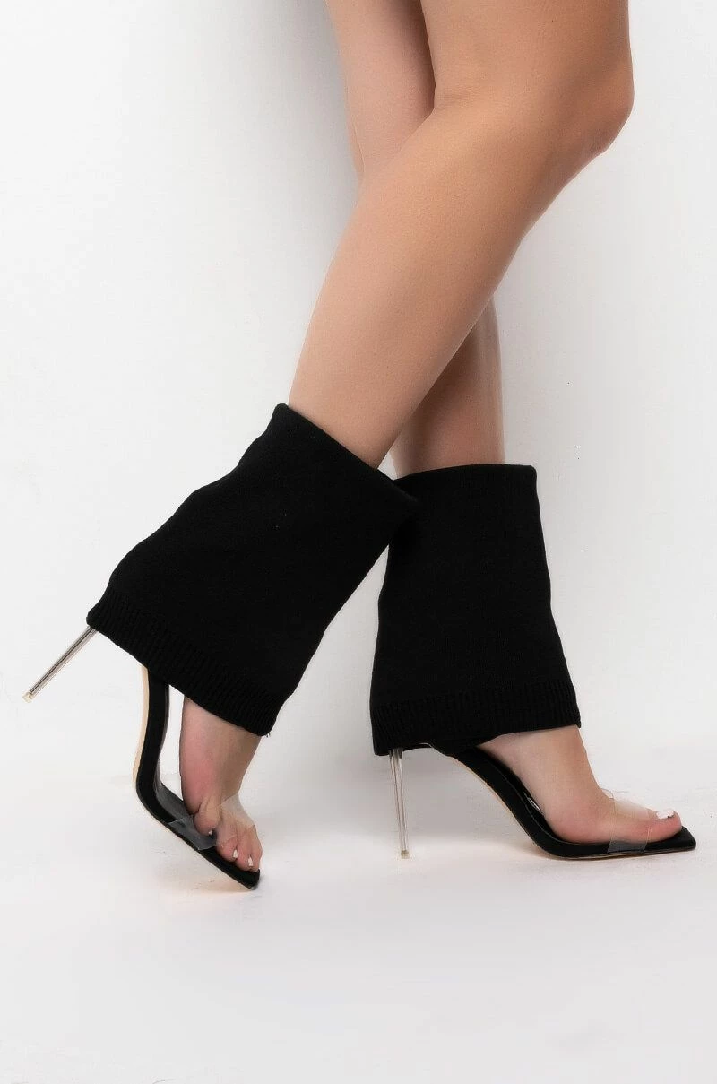 We’re falling for The AZALEA WANG Love Me Like You Do Stiletto Sandal In Black. This trendy sandal-boot hybrid features a fold over stretch knit upper, a mid-calf shaft height, and a slim acrylic stiletto heel. Complete with a square peep toe, PVC toe strap, and a slip on fit. Try tucking a pair of skinny jeans into these bad boys for a transitional spring look. Fit and details (approx. measured from a women’s 8): -Man made Upper -Open toe -Stiletto heel -7″ shaft height -4″ heel height – Imported Product ID: 289514