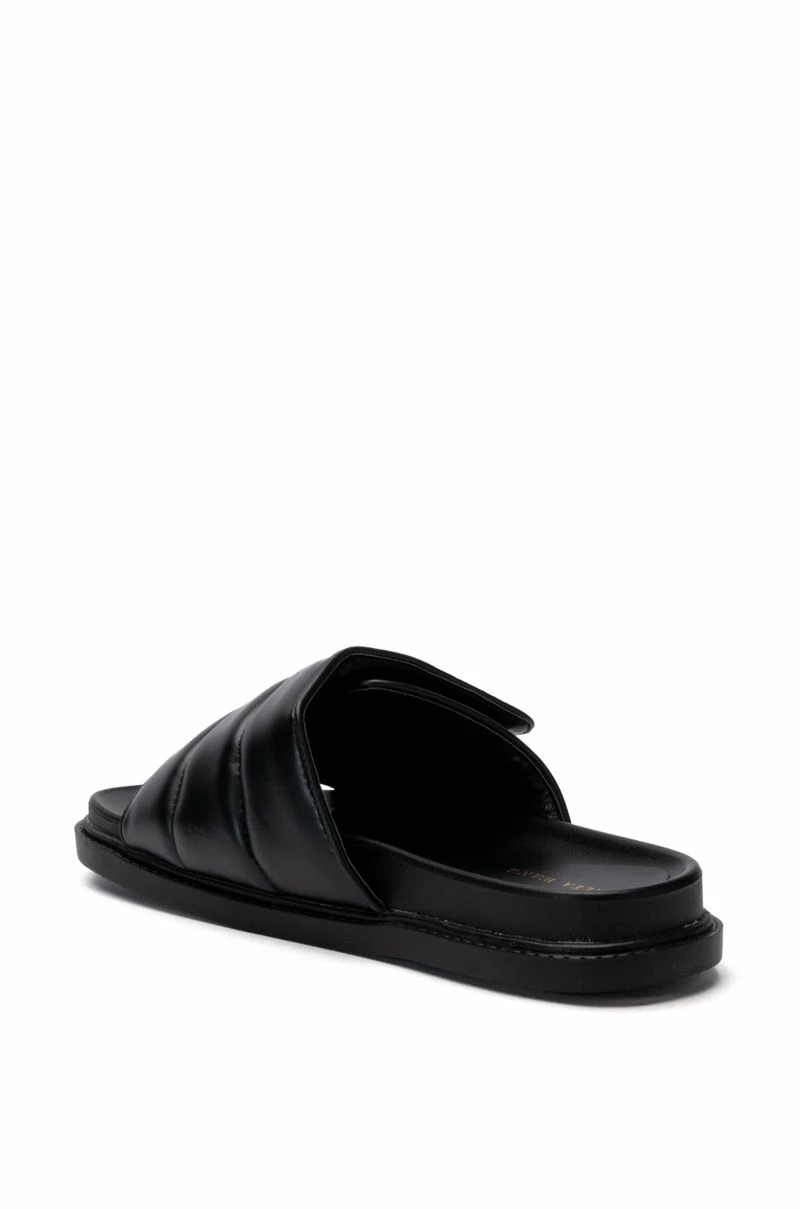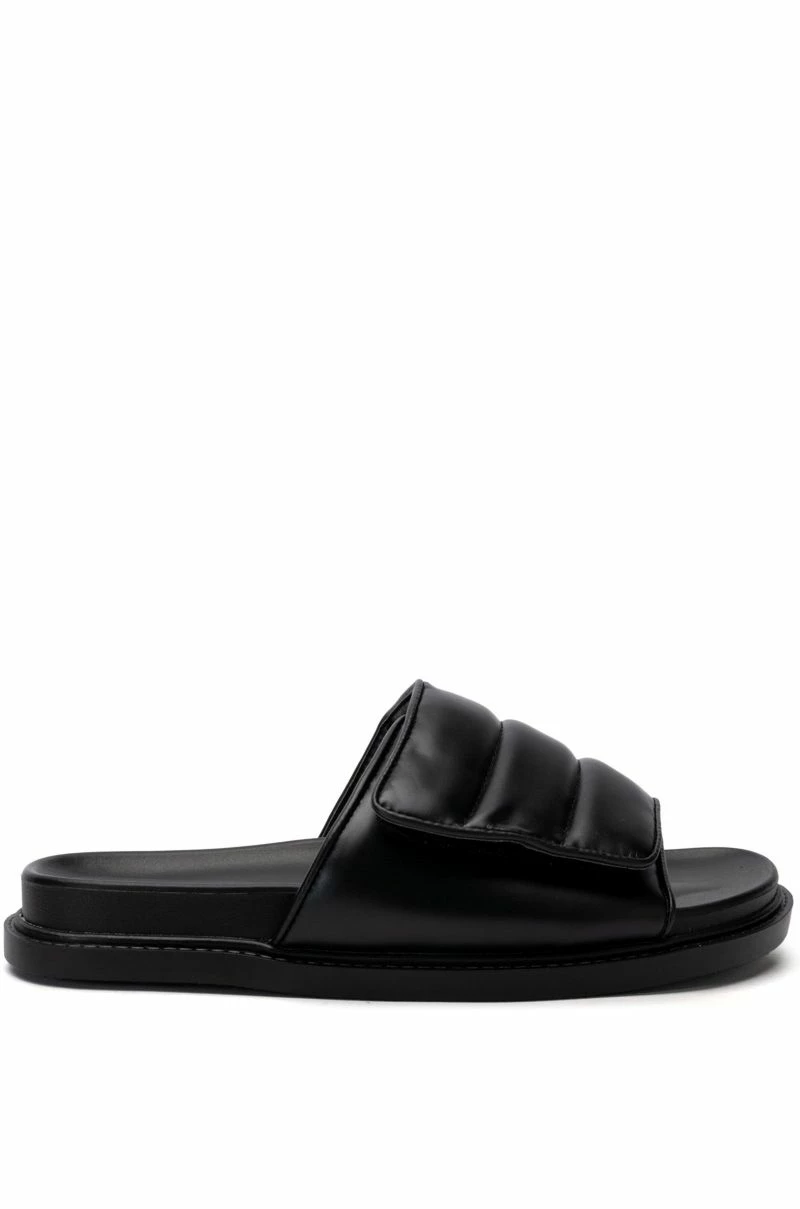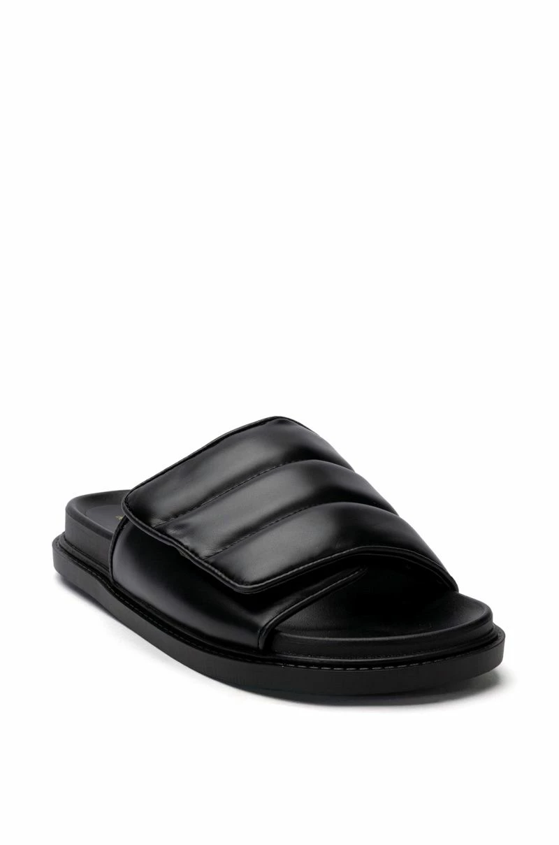 The AZALEA WANG Nilesh PU Sandal In Black is a chic everyday slide featuring a wide, cushioned foot band upper with velcro closure, a rubber midsole, a flatform rubber sole, and an open almond toe silhouette. Perfect for your comfy, casual, or athleisure looks!