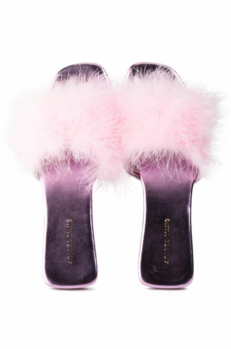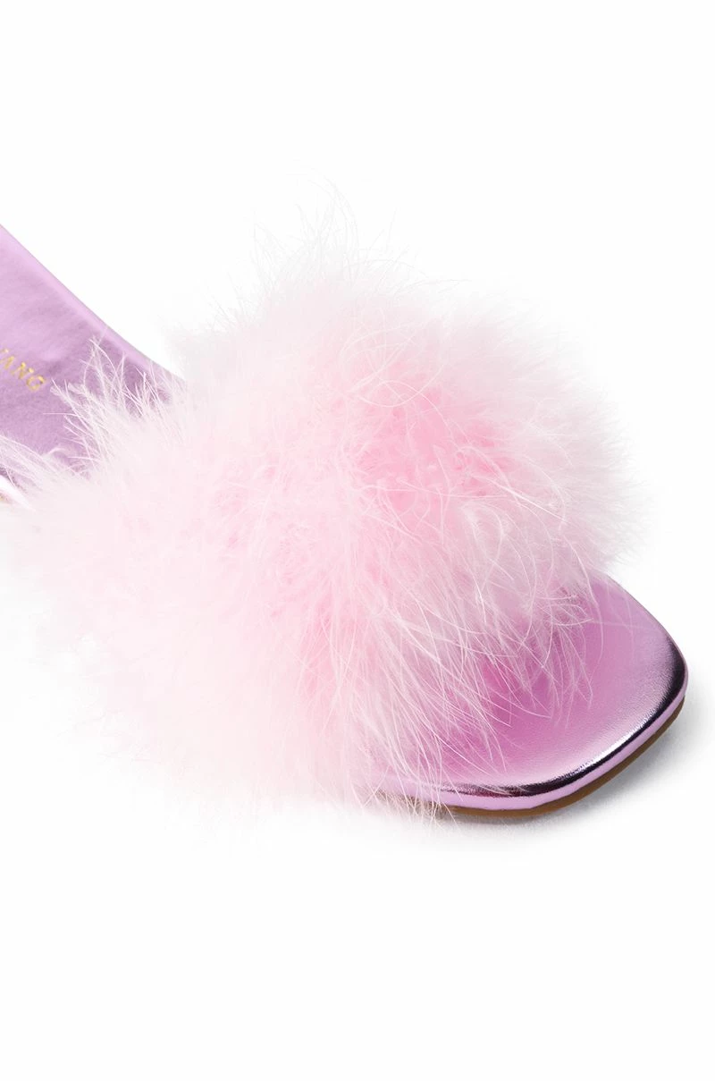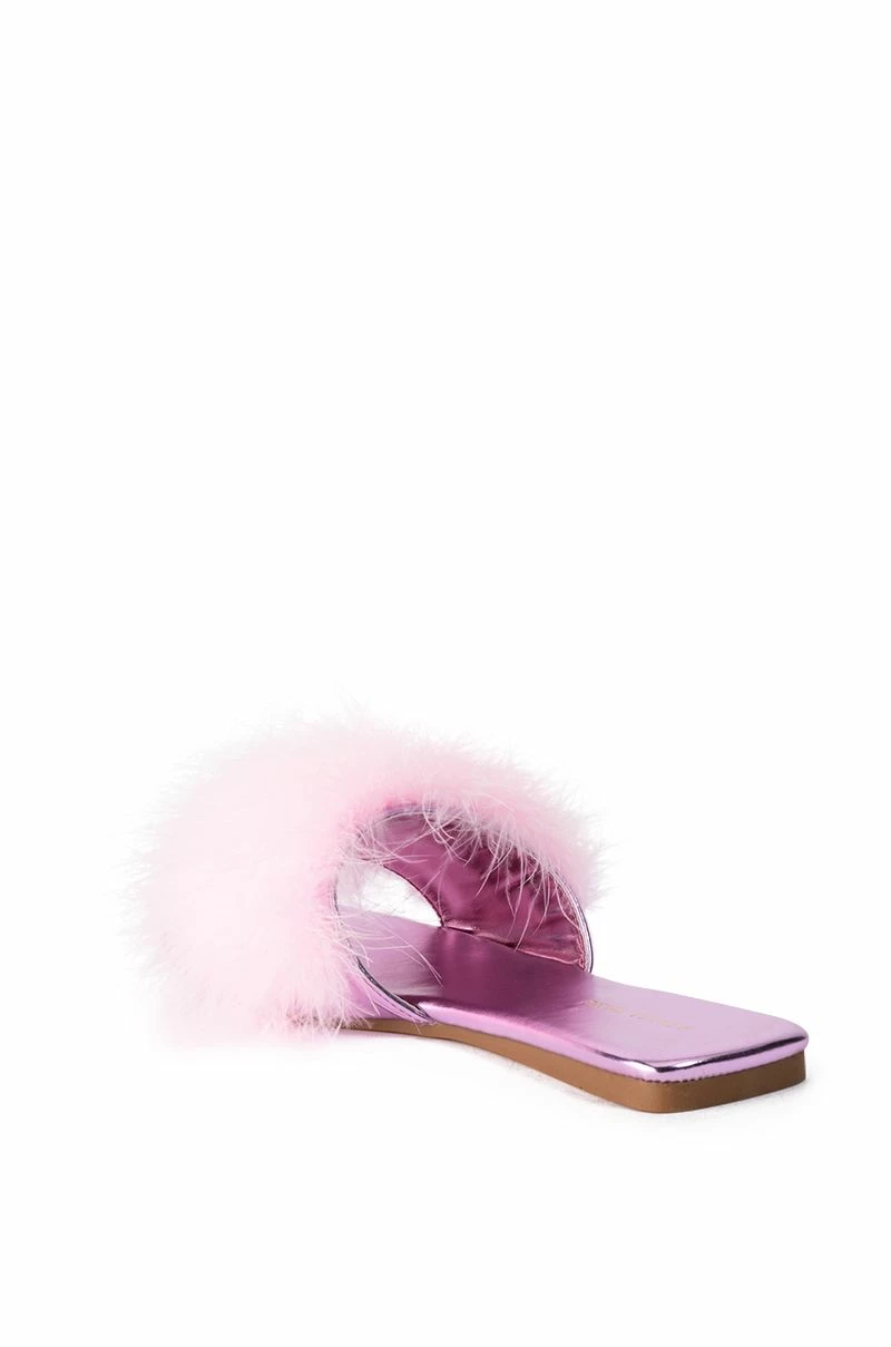 The AZALEA WANG Paisley Flat Feather Sandal In Pink is a simply chic flat sandal featuring a metallic faux leather upper, a feather embellished toe band, cushioned insole, and an open toe silhouette. Complete with a flat outsole.