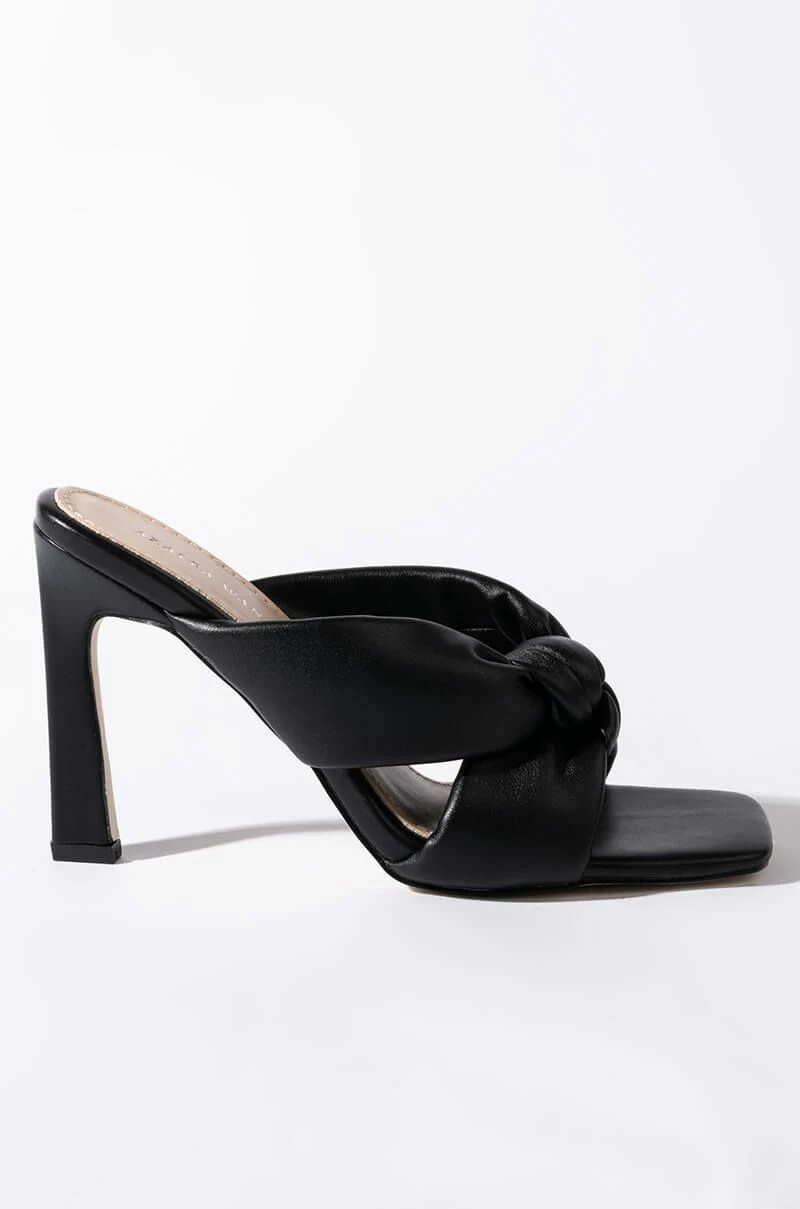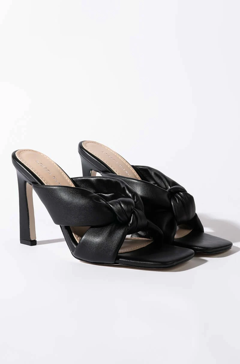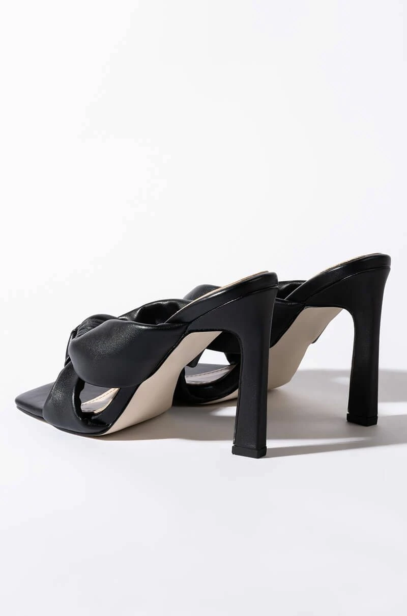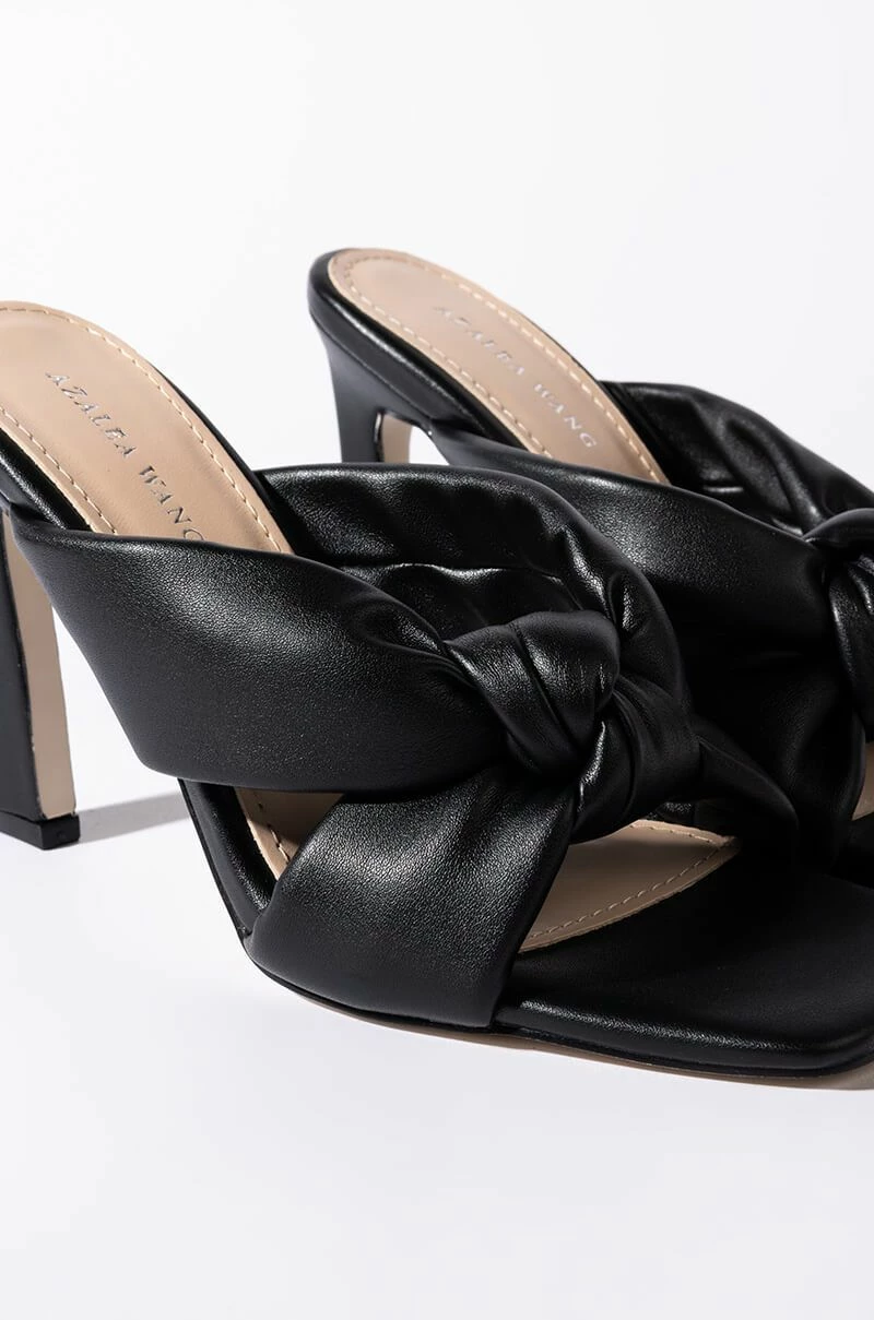 The AZALEA WANG Sweet Like Sunday Square Toe Sandal In Black features a plush faux leather upper, a cushioned sole, knot front straps, a square open toe design, and a slim stiletto heel. Wear these with your fave denim and a chic off the shoulder blouse.