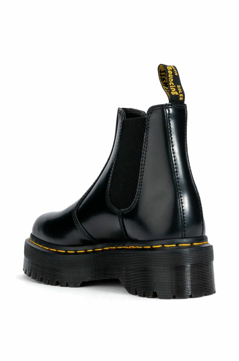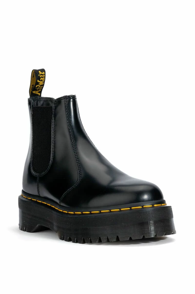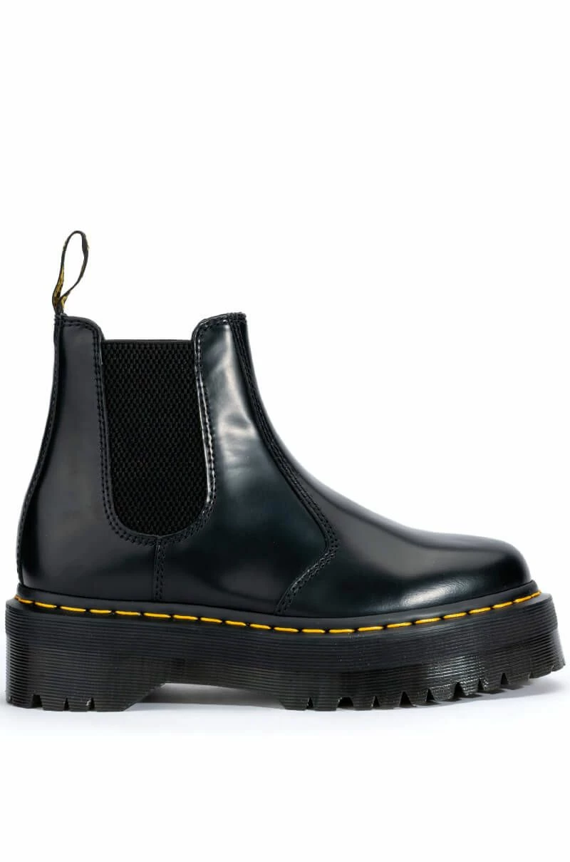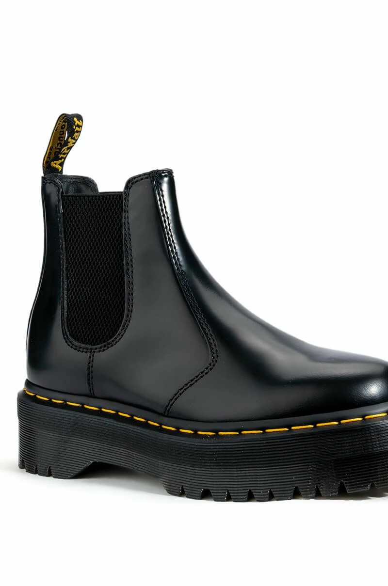 The DR MARTENS 2976 Quad Polish Smooth is a sleek closed toe Chelsea boot featuring a leather upper, logo heel loop, bright yellow stitching around the sole, and the classic Air Walk Cushion platform sole. A slip on fit and elastic side paneling provide a secure stomp.