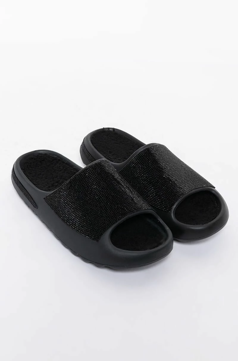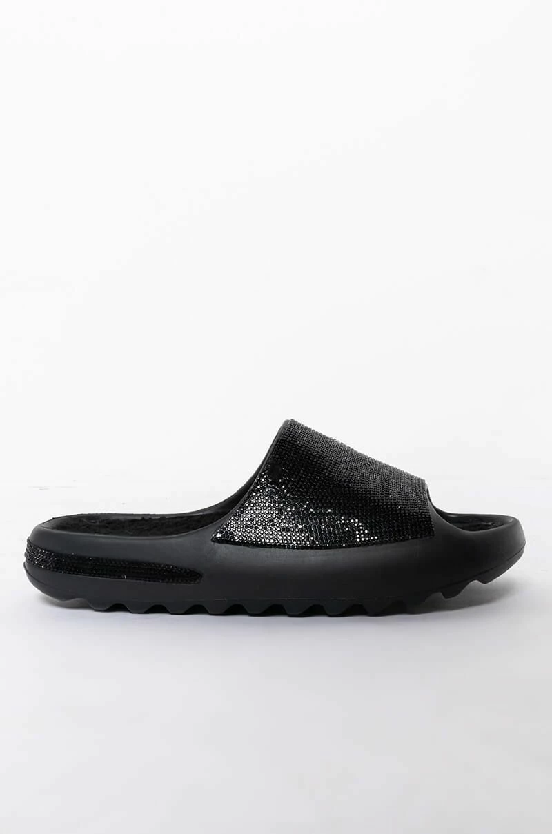 The AKIRA Label Let It Go Flat Sandal in Black is a simple yet glam slide that goes with everything. Features a flat sole, rhinestone embellishments at the strap and sides, and a slide-on fit. Wear with cuffed denim and your favorite toe rings to be the relaxed, stylish type.