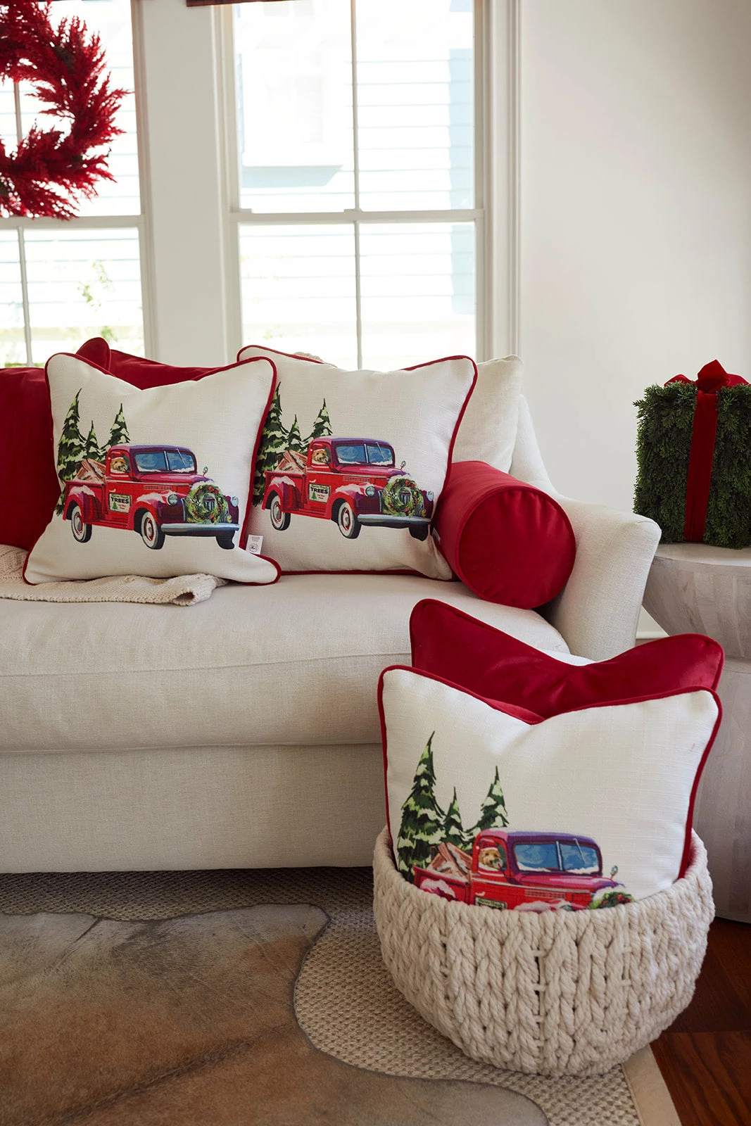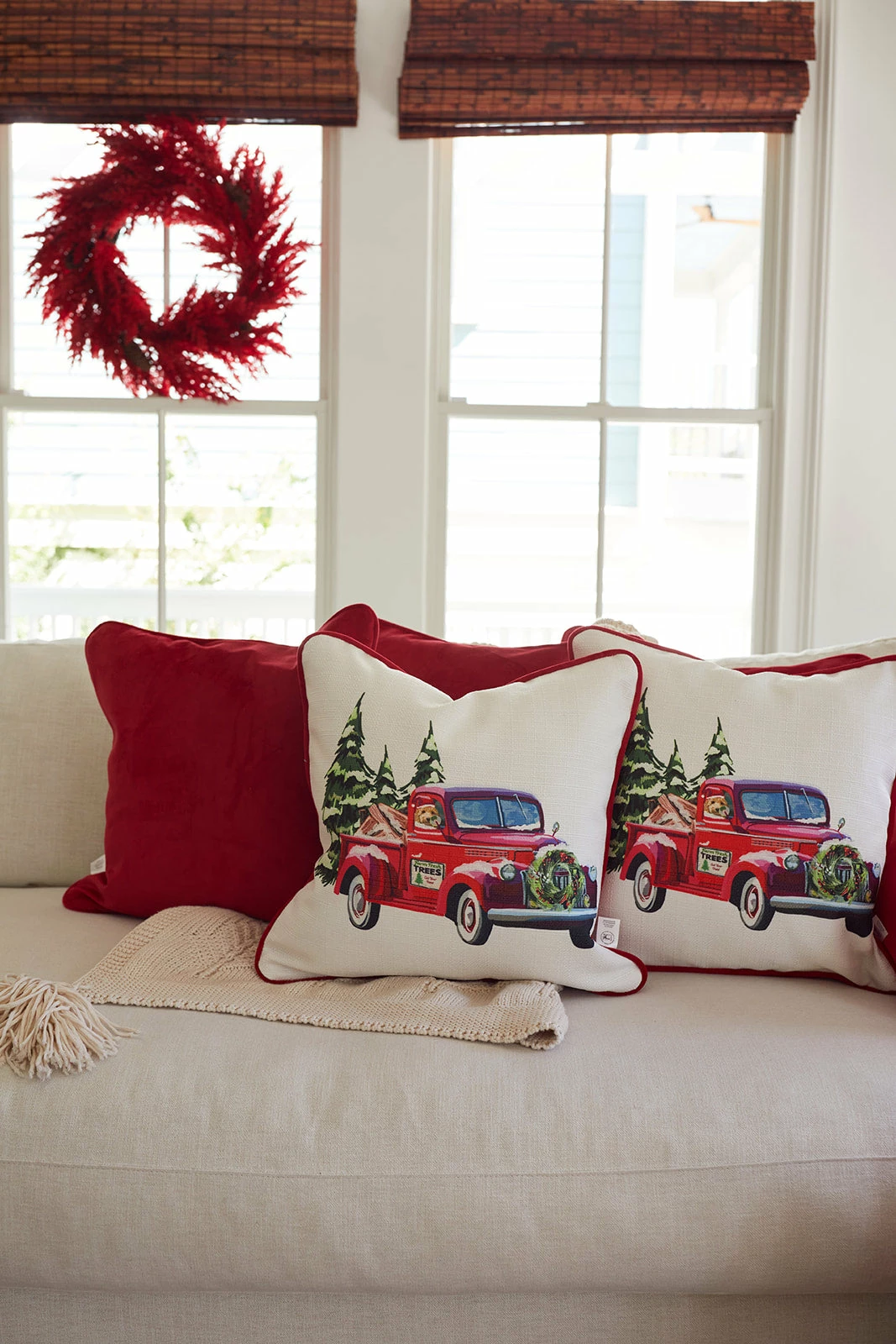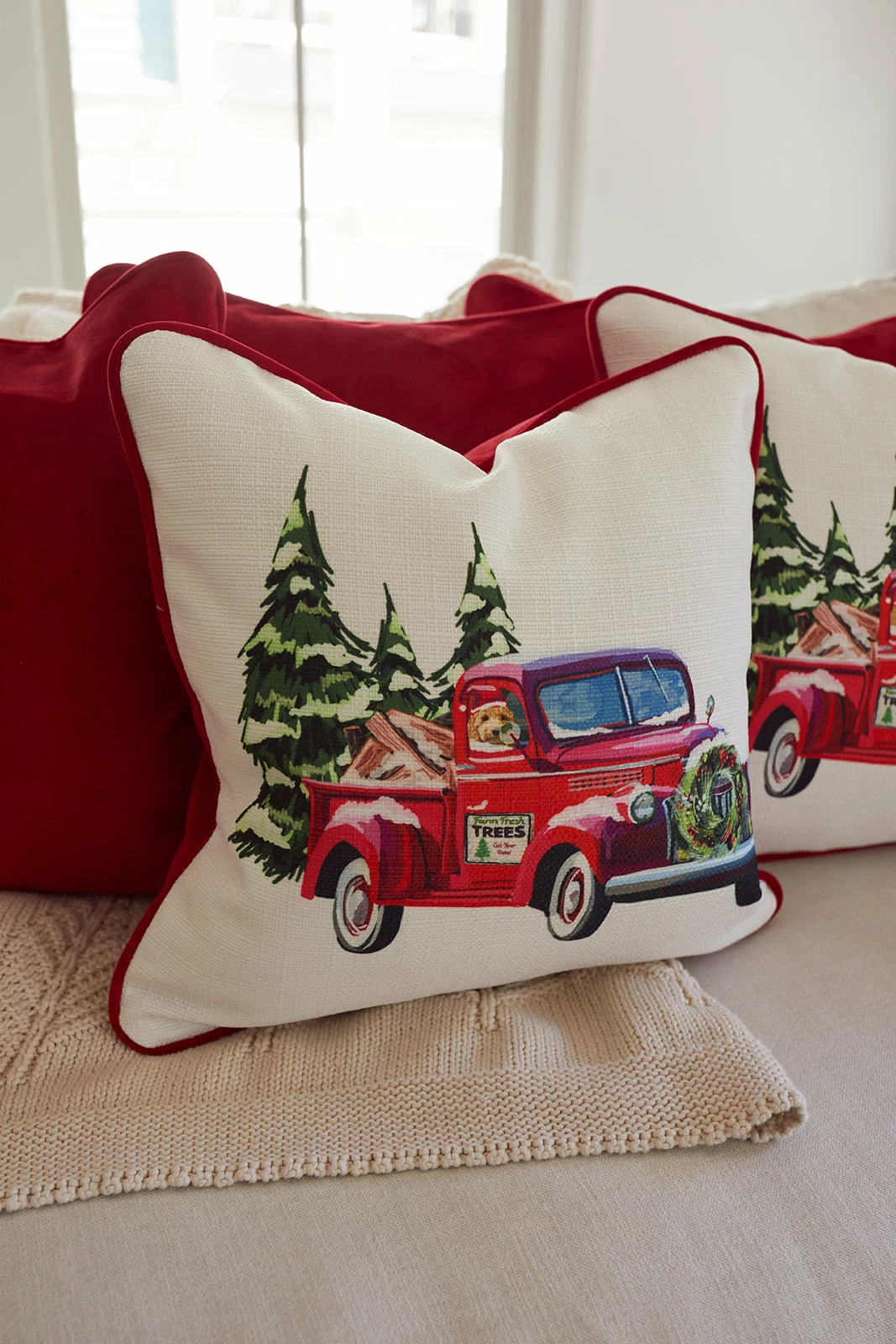 Our Holiday Farm Tree Truck Pillow UPDATED for 2022 will add elevated coziness + coordinate perfectly with our all new Holiday 2022 Velvet Bolster in Scarlet.