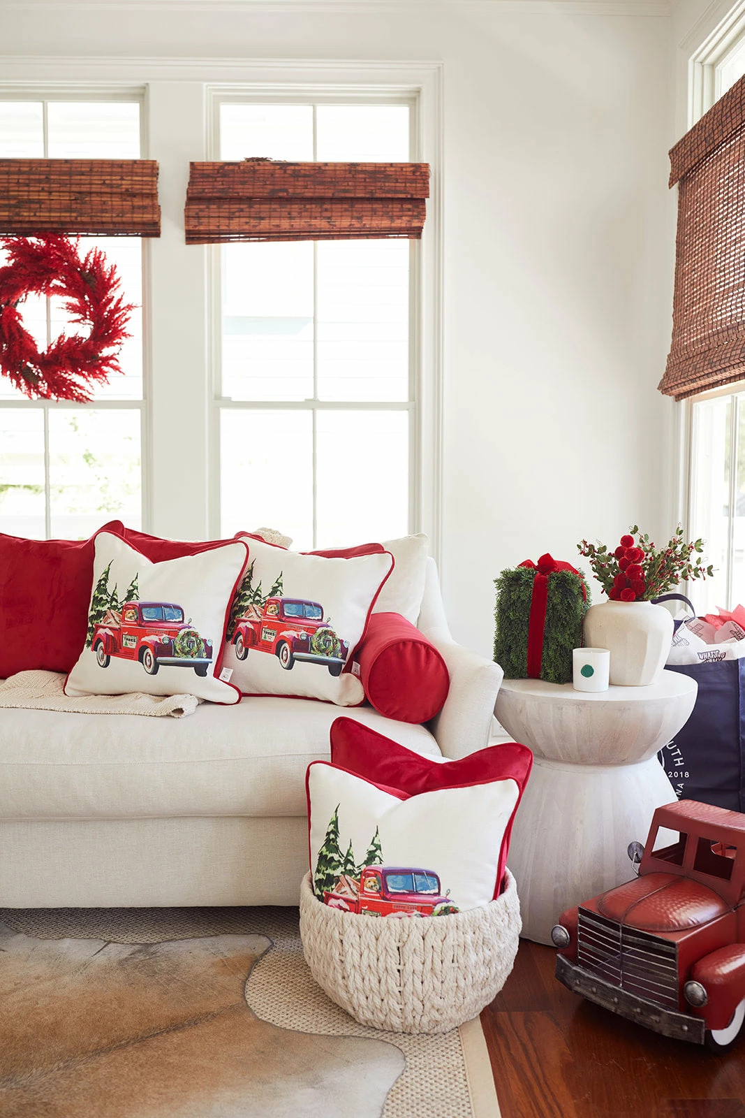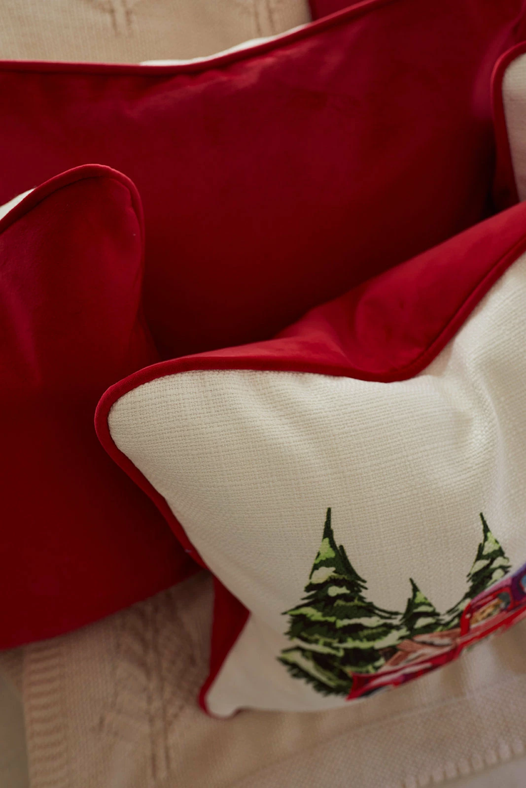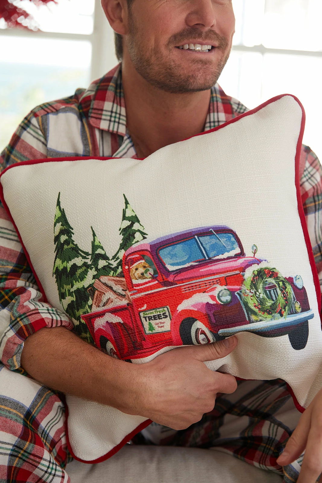 Our Holiday Farm Tree Truck Pillow UPDATED for 2022 will add elevated coziness + coordinate perfectly with our all new Holiday 2022 Velvet Bolster in Scarlet.