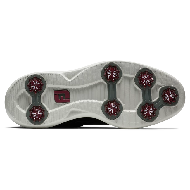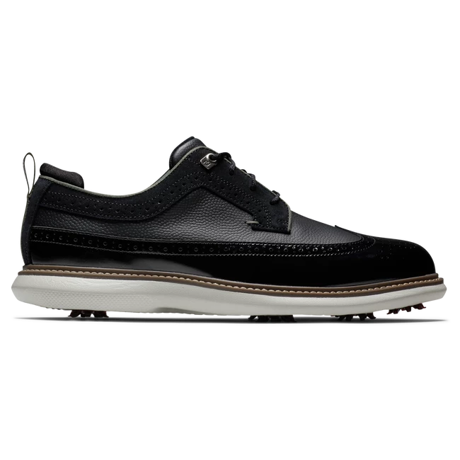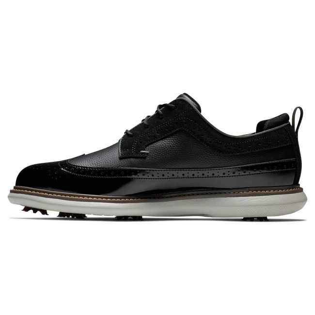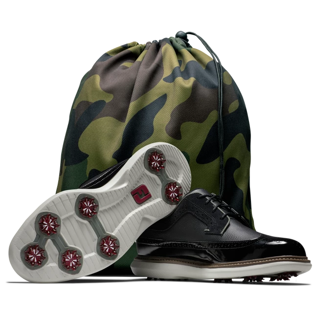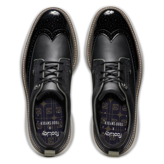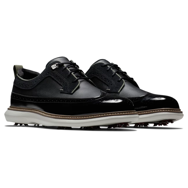 The number one golf shoe, in both performance and style — this is Todd Snyder’s sartorial take on FootJoy’s exceptional footwear. Luxe on the surface and state-of-the-art under the hood, they utilize advanced lightweight materials and proprietary technology. The body of the shoe is crafted from pebble grain leather and features a patent overlay. The Traditions Series delivers lightweight, super-cushioned comfort and game-changing traction — all with classic full-brogue detailing, from the decorative wingtip to the collar.